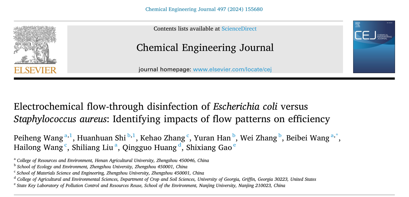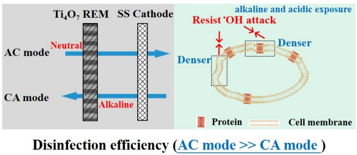 环境中的耐药菌和抗生素污染问题引起了全球关注,耐药菌及病毒仍是公众健康的主要威胁,水体则是耐药菌在环境中传播的主要媒介。基于Ti4O7孔状电极的反应性电化学膜(REM)能够有效增大污染物的相间传质速率和电活化表面积,在污染物去除和耐药菌灭活方面表现出优良特性。然而,其消毒、防污机理尚不清楚。另外,耐药菌包括革兰氏阳性菌(G +)和革兰氏阴性菌(G - )两类,其细胞壁结构和组成存在显著差异。在电化学氧化中,不同水力条件及细胞膜表面不同的组成引起的细胞失活机制差异尚不清楚。本研究发现流动模式决定了Escherichia coli(大肠杆菌)和Staphylococcus aureus (金黄色葡萄球菌)的失活效率。具体而言,阳极-阴极(AC)流模式下,E. coli和S. aureus的失活率分别为5.22和5.47 log,而在阴极-阳极(CA)流模式下,失活率下降到小于1 log。进一步研究发现,阳极电化学氧化反应前的耐药菌暴露的酸碱度决定耐药菌杀菌效率,即中性条件下E. coli和S. aureus能被完全灭活,而在酸性和碱性条件下耐药菌的灭活效率极低。E. coli和S. aureus失活效率的差异也受水力条件下和细胞壁结构的影响,官能团模型和分子动力学模拟表明,细胞结构特别是膜蛋白复合物在碱性和酸性环境下的致密变化抵抗了电氧化对膜结构的攻击。该研究为单次过滤高效处理耐药菌抗性提供了新方法,对控制耐药菌抗性传播具有重要的理论和应用价值。研究成果以 “Electrochemical flow-through disinfection of Escherichia coli versus Staphylococcus aureus: Identifying impacts of flow patterns on efficiency” 为题,发表在Chemical Engineering Journal(2024, 497: 155680)。哔咔漫画硕士研究生王沛恒(已毕业)和郑州大学副教授石欢欢为论文第一作者,哔咔漫画王贝贝为论文通讯作者。