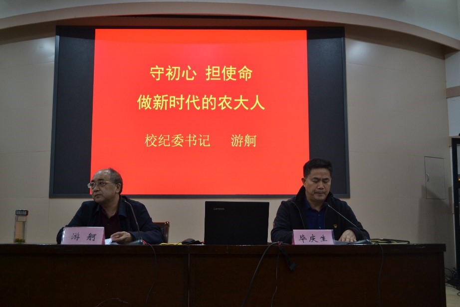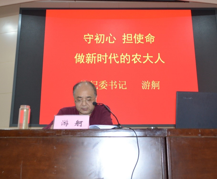游书记指出,“不忘初心、牢记使命”主题教育是在建国七十周年之际开展的全党又一次思想大教育,我校全体党员都应当提高政治站位,深刻理解本次主题教育的重大意义。又从我校百年建校史入手,指出农大为了河南乃至全国的粮食安全做出过重大贡献,在新时代,每一名党员都应当守初心,担使命,做有责任能担当的农大人;游书记强调,保持清醒头脑,清廉自律,做守纪律懂规矩的农大人。管党首先是管好干部。要把从严管理干部贯彻落实到干部队伍建设全过程,坚持从严教育、从严管理、从严监督。