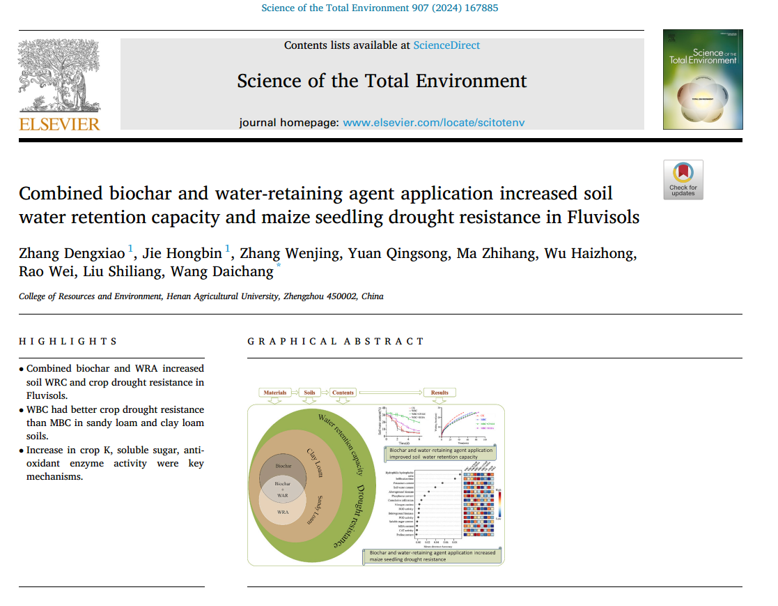 本研究通过盆栽试验等方法,研究了两种生物质炭(小麦秸秆炭WBC和玉米秸秆炭MBC)和两种商品保水剂(聚丙烯酰胺CPAM和淀粉接枝丙烯酸钠SGSA)配施条件下,对不同质地潮土的持水性能及作物抗干旱胁迫能力的影响及其作用机制。研究发现,生物质炭和保水剂均显著提高了砂壤质潮土和黏壤质潮土中亲水性官能团的丰度,因此提高了土壤的持水能力。与对照相比,生物质炭和保水剂配施显著提高了两种质地潮土的田间持水量,抑制了干旱条件下土壤水分的挥发散失,同时降低了土壤水分的入渗速率。WBC对土壤持水性的效应优于MBC,且CPAM优于SGSA。另外,生物质炭和保水剂配施通过提高苗期玉米体内钾含量和可溶性糖含量,提高抗氧化酶活性和降低MDA含量,从而改善了作物生理抗旱性能。因此,生物炭和保水剂配施可提高潮土的持水性和作物抗旱性。