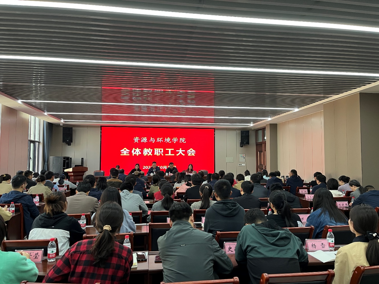 在龙子湖校区力行楼中338报告厅召开全体教职工大会,对学院近期工作进行安排部署,会议由院党委书记李国权主持,学院全体教职工参加会议。