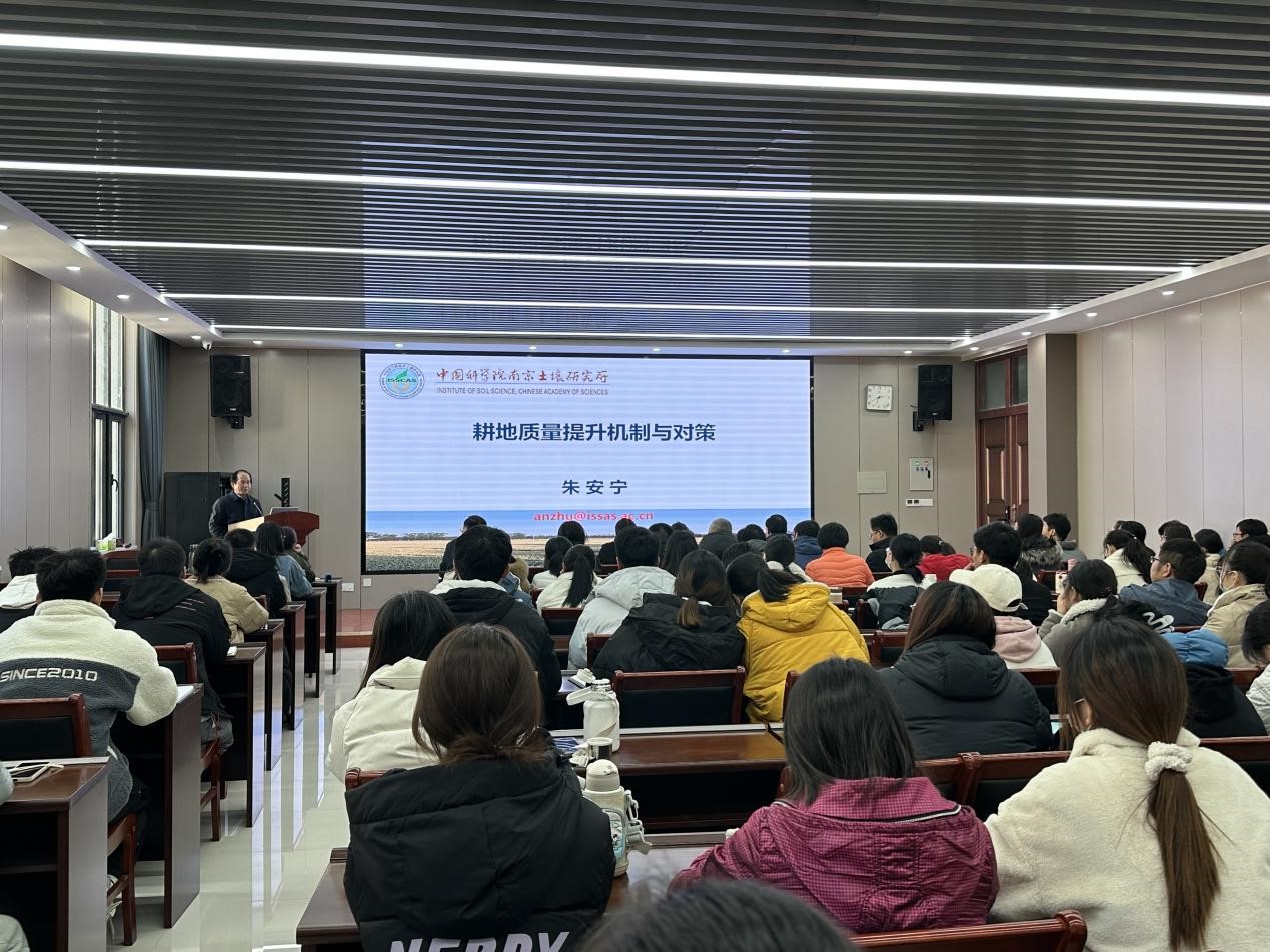 南京土壤研究所朱安宁研究员应邀在力行楼中-338报告厅为哔咔漫画师生作“耕地质量提升机制与对策”学术报告,部分教师和研究生参加,院长王宜伦主持。
