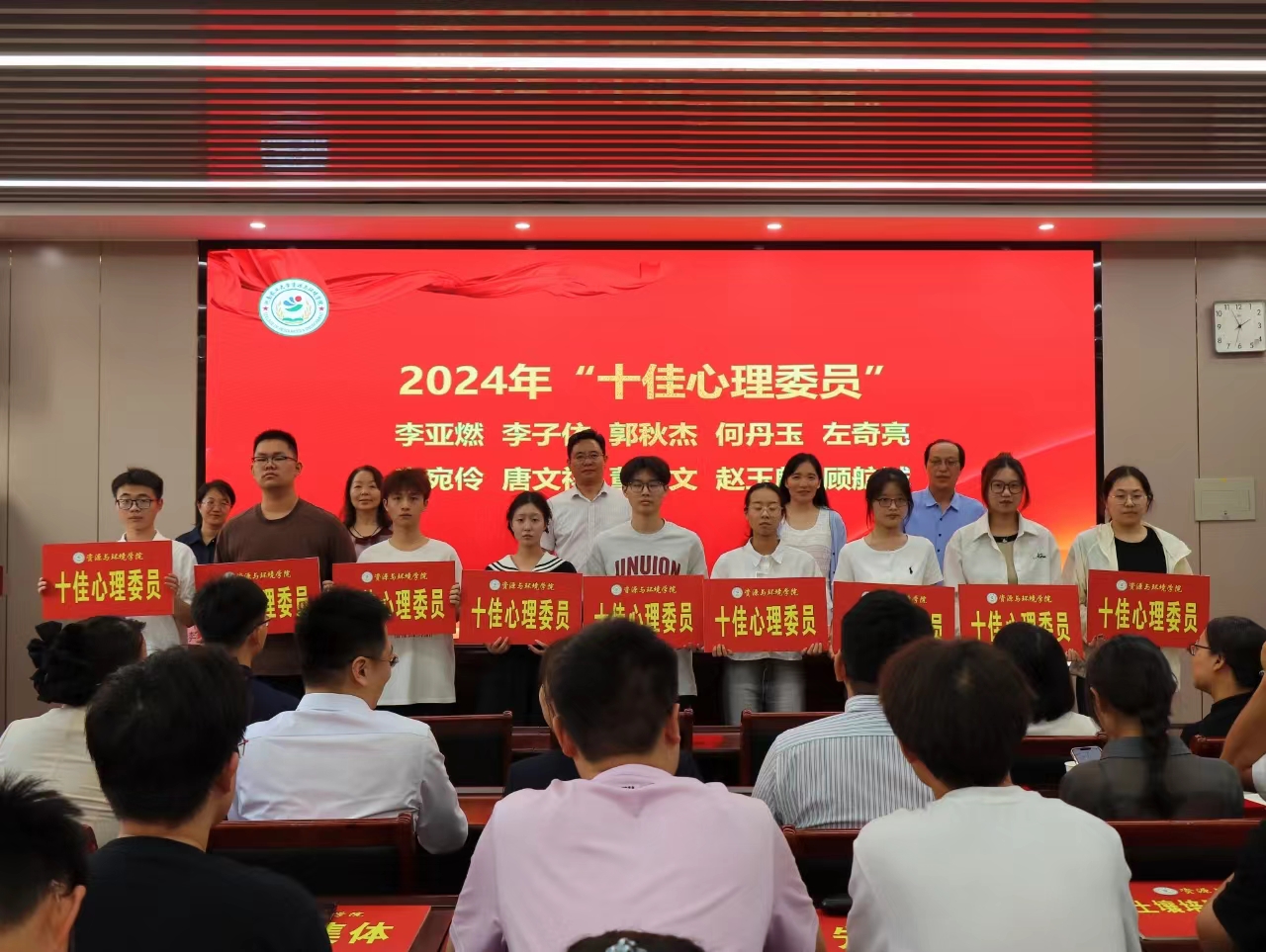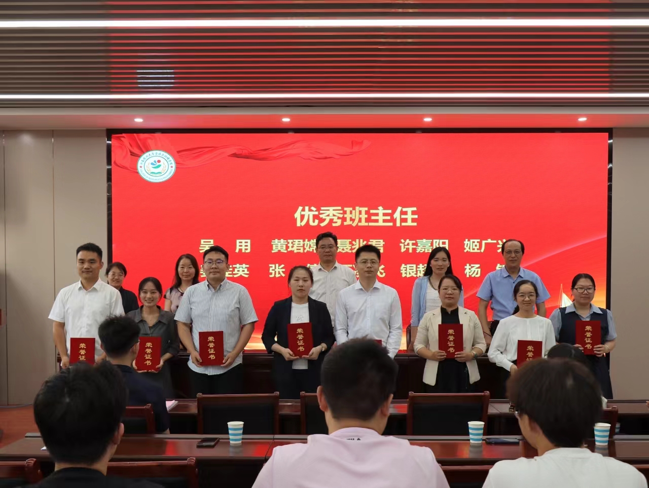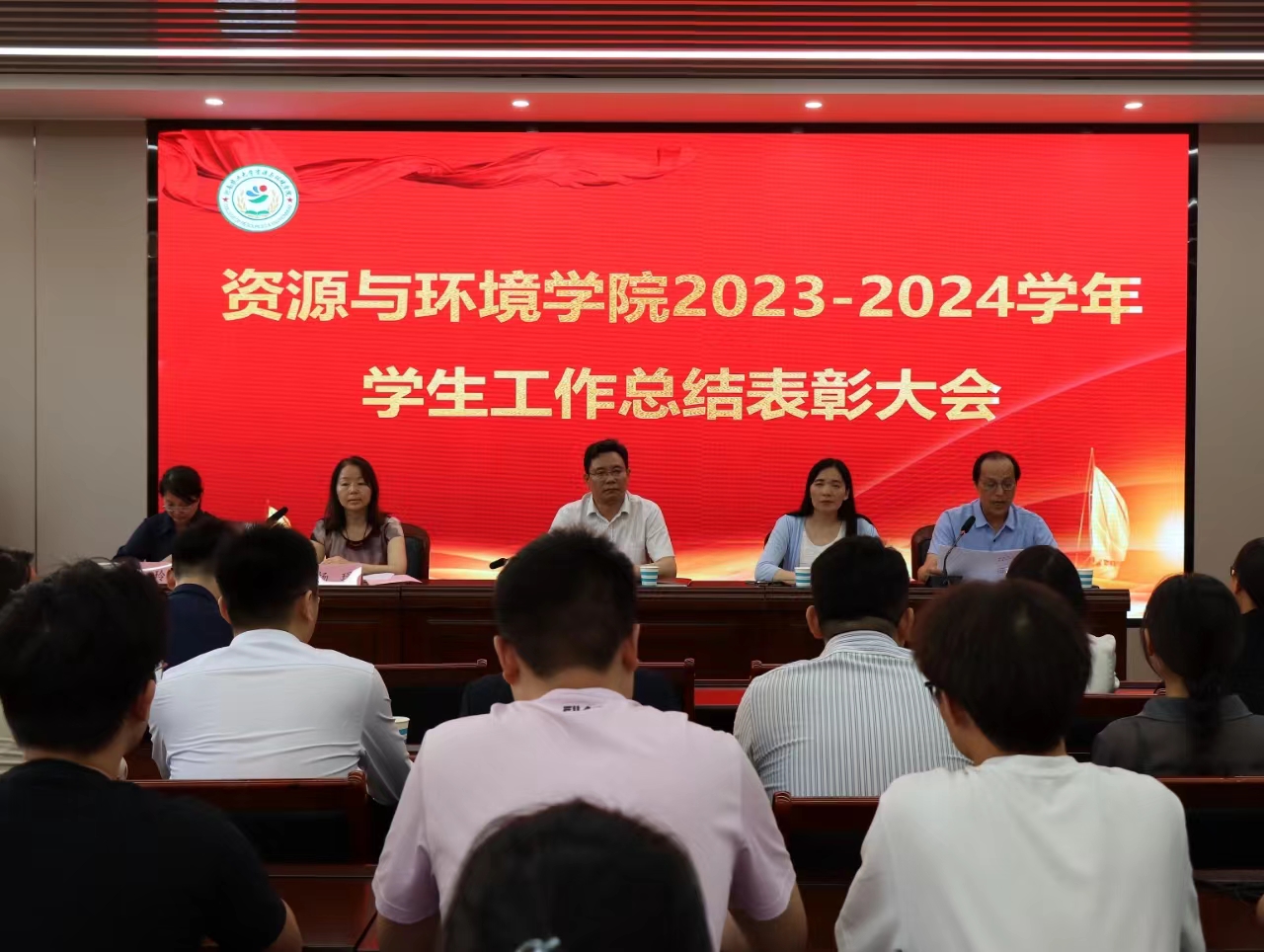 于龙子湖校区力行楼338会议室隆重举行2023-2024学年学生工作总结表彰大会。院党委书记李国权,院党委副书记陈景红,副院长杨璟、刘世亮、李玲,各系室负责人,全体团委老师及获奖代表参会,会议由陈景红主持。