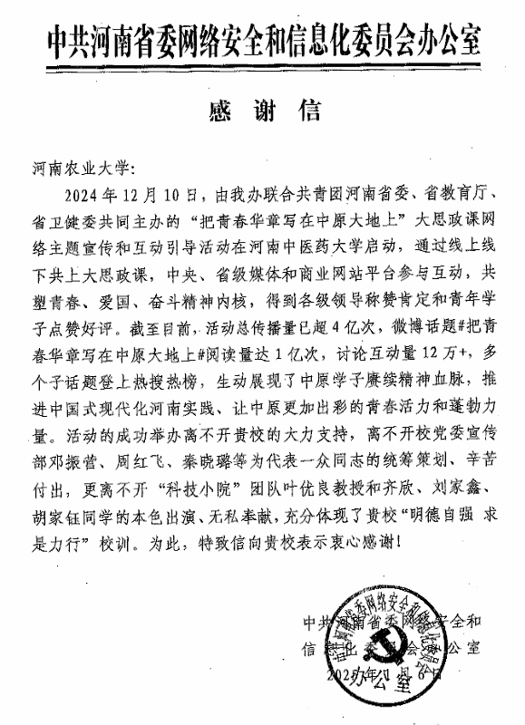 近日,我校收到中共河南省委网络安全和信息化委员会办公室的感谢信,感谢哔咔漫画科技小院团队在“把青春华章写在中原大地上”大思政课网络主题宣传和互动引导活动中的精彩表现。
