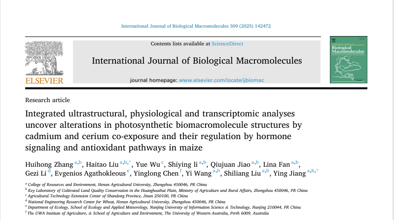 鉴于高浓度的Cd和Ce共暴露所带来的高生态风险以及对玉米叶片显著的损伤,综合超微结构、生理生化、转录组学和分子响应,探究Cd和Ce暴露影响玉米生长的潜在机制。研究结果表明,Cd和Ce暴露通过破坏光合作用和叶绿素合成,引起了ROS失衡,导致了对玉米生长的抑制。然而,与单独的Cd暴露相比,Cd和Ce共暴露对玉米光合系统的影响较小,因其减少了嗜锇质球蛋白的产生。转录组学和分子对接分析表明,Cd和Ce共暴露存在拮抗作用。Ce有助于修复Cd暴露的叶片中的光系统,促进叶绿素的合成和光合作用。然而,对碳同化蛋白结构的干扰和对激素信号传导、AsA-GSH循环和苯丙素代谢途径的破坏导致了氧化应激,主要表现在活性氧(ROS)水平升高及金属解毒途径受损。基因共表达网络分析挖掘出关键基因SOT5(Zm00001eb327110),发现该基因与光合作用、ROS清除和激素信号传导有关,是开发抗逆作物品种的潜在基因。这项研究为玉米如何应对重金属和稀土元素毒性提供了新的见解,并强调了提高抗逆性的关键途径。研究结果以“Integrated ultrastructural, physiological and transcriptomic analyses uncover alterations in photosynthetic biomacromolecule structures by cadmium and cerium co-exposure and their regulation by hormone signaling and antioxidant pathways in maize”为题于2025年3月29日在线发表在《International Journal of Biological Macromolecules》上。