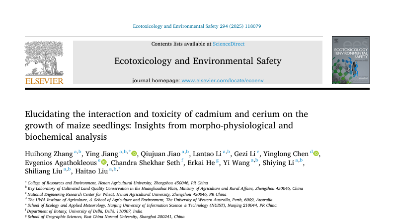 稀土元素具有全球性的重要战略和经济意义。然而,稀土元素的广泛开发和应用,导致了其在环境中的过量积累。此外,稀土元素污染通常伴随着土壤中的重金属污染,这已成为突出的环境问题。目前,关于稀土和重金属共暴露对作物的毒性效应及生态功能的机制研究较少。铈(Ce)和镉(Cd)分别为稀土和重金属代表元素,本研究以玉米为供试对象,通过设置不同浓度Ce和Cd,探究Ce和Cd暴露对玉米生长的交互作用及毒性机制。研究结果表明,Cd和Ce均以剂量依赖的方式通过增强氧化应激损伤抑制了玉米的生长。Cd和Ce的共暴露对玉米生长具有复杂的交互作用。Ce能够提高叶绿素含量,同时减轻镉诱导的叶片黄化现象。与单独添加50 μM Cd处理相比,分别添加10 mg·L−1和100 mg·L−1 Ce显著增加了叶绿素a含量52.2%和50.2%。生理生化效应水平指数结果表明,Cd和Ce的主要相互作用模式为拮抗作用,高浓度的Cd和Ce共暴露的生态风险比单Ce更高。研究为稀土元素和重金属共暴露的毒理学效应提供了重要的见解,也为未来有关联合污染的环境风险研究和管理策略提供了指导。研究结果以“Elucidating the interaction and toxicity of cadmium and cerium on the growth of maize seedlings: Insights from morpho-physiological and biochemical analysis”为题于2025年3月20日在线发表在《Ecotoxicology and Environmental Safety》上。