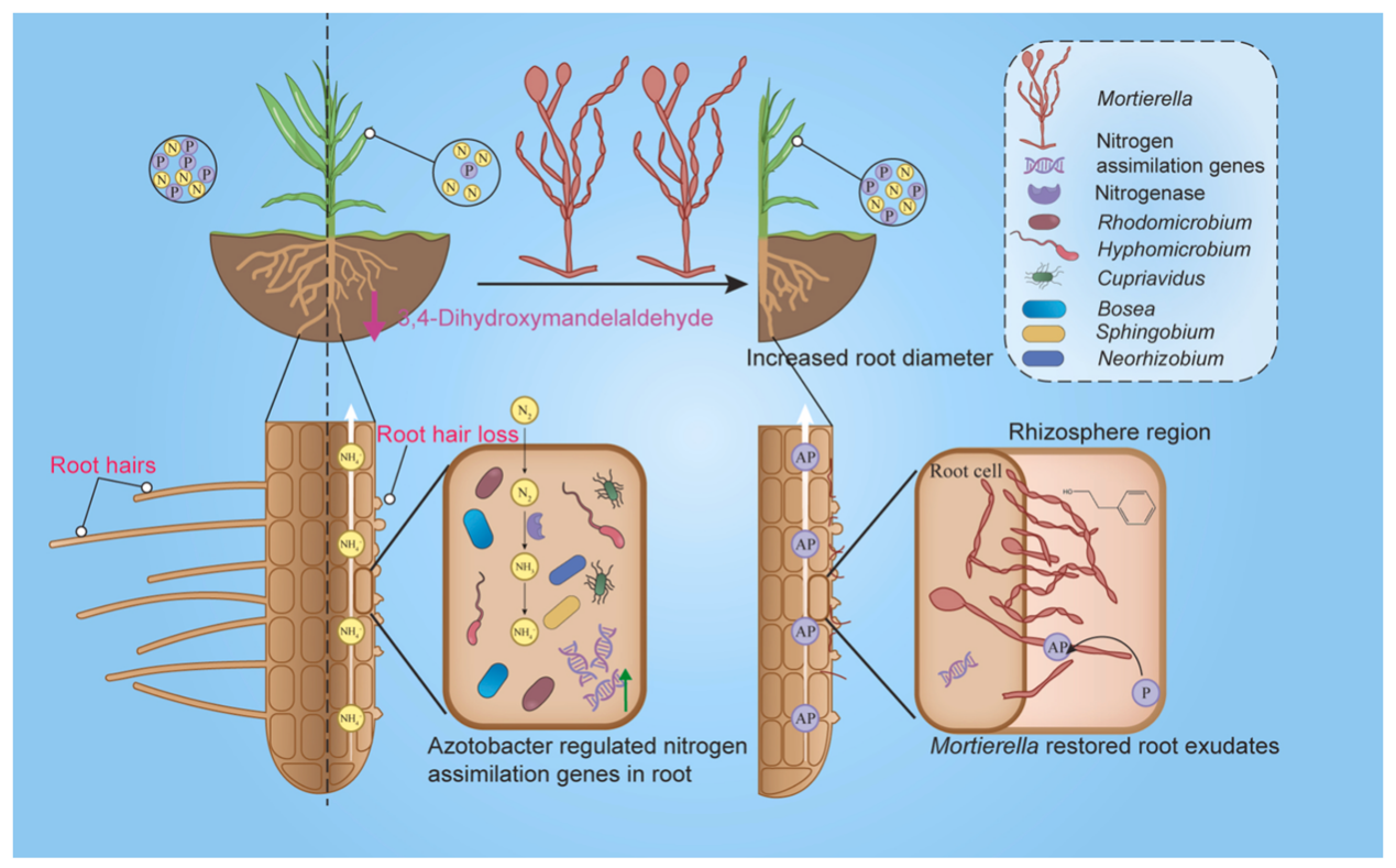研究发现,根毛缺失导致玉米生物量和产量分别下降至野生型的30%和25%,叶片磷含量显著降低31.2%。同时,根毛缺失显著改变了根际和根内微生物群落结构,其中有益真菌被孢霉的相对丰度在无根毛突变体根际中下降了超过80%,且与多种下调的根系分泌物密切相关。代谢组分析显示,突变体根系分泌物中约75%的代谢物丰度下调,尤其是与被孢霉招募相关的关键代谢物如3,4-二羟基扁桃醛等显著减少。玉米突变体可通过上调根内固氮细菌的丰度及宿主铁氧还蛋白硝酸盐还原酶基因的表达,部分补偿了氮素吸收的不足。然而,这种内源补偿机制不足以弥补磷素缺乏带来的生长限制。