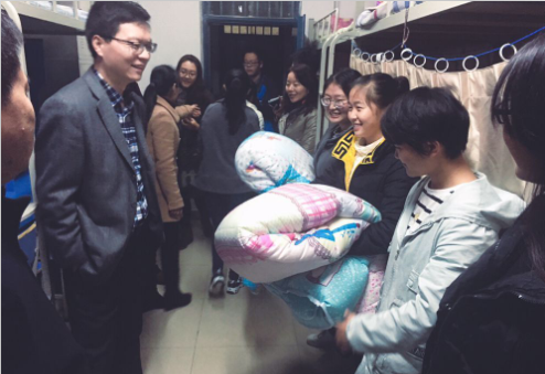 党委书记毕庆生、党委副书记李强、副院长杨璟、副院长王宜伦、团委书记王玲、17级辅导员李畅老师走访了17级新生宿舍并给同学们送上了充满关怀的棉被。