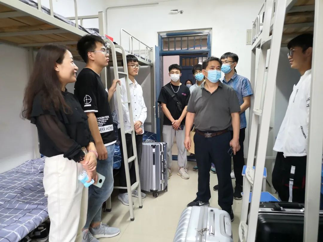 走访过程中,领导老师与学生进行亲切交流,细心提醒同学们在新环境中要注意宿舍安全与卫生,尽量快速适应新环境。毕庆生书记教导同学们从高中走进大学,应及时调整心理状态,以学业为重,切不可贪玩懒惰,要让自己的大学生活变得充实而有意义。王玲书记叮嘱同学们不管在学习还是生活上,“有困难找老师”,应积极与辅导员交流,以顺利解决问题。
