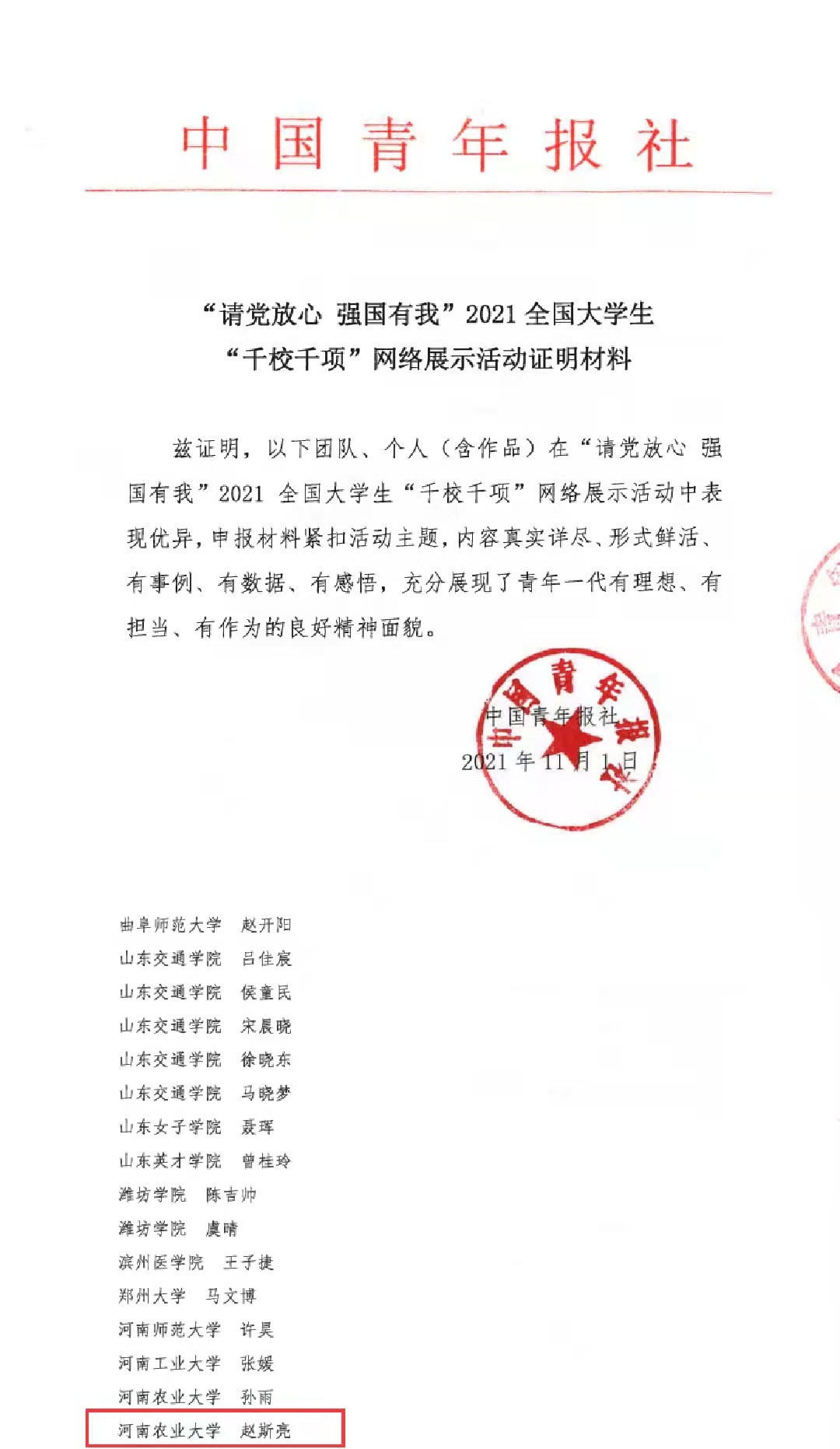 近日,中国青年报·中青在线开展的“请党放心 强国有我”2021全国大学生“千校千项”网络展示活动公布了最终名单。哔咔漫画2019级环境生态工程专业学生赵斯亮脱颖而出,成功上榜“千校千项”个人事迹名单!